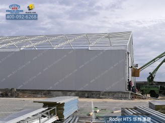 倉儲篷房是可以搭建3-80米的跨度,大面積搭建中間也是沒有立柱,在設計上華燁是引進德國的靜力學技術,在設計的前期銷售人員會測量當地的風力,再結合近幾年使用地的最大雪荷載進行設計,整體可抗風10級,滿足四季惡劣天氣的安全使用。